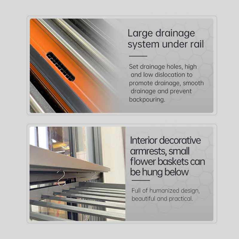 Com puxadores decorativos integrados e uma borda inferior de bloqueio de água, as janelas são ainda mais aprimoradas para impermeabilização e prevenção de refluxo. O grande sistema de drenagem com trilho inferior de 2,5 mm de espessura evita vazamento e refluxo de água, apresentando orifícios de drenagem para uma descarga suave da água.