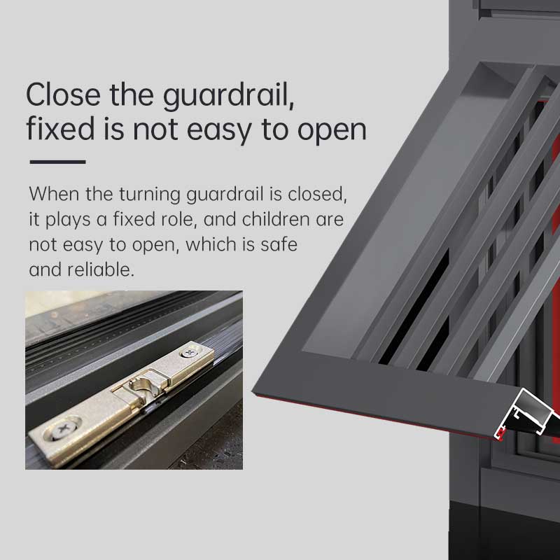 O guarda-corpo fechado proporciona segurança adicional e, quando fechado, funciona como uma barreira fixa, dificultando a abertura das crianças, garantindo a segurança. A linha de pressão de segurança estrutural pode suportar forte pressão do vento, com resistência à tração e escoamento cinco vezes maior que as 50 janelas comuns, garantindo segurança contra a pressão do vento.